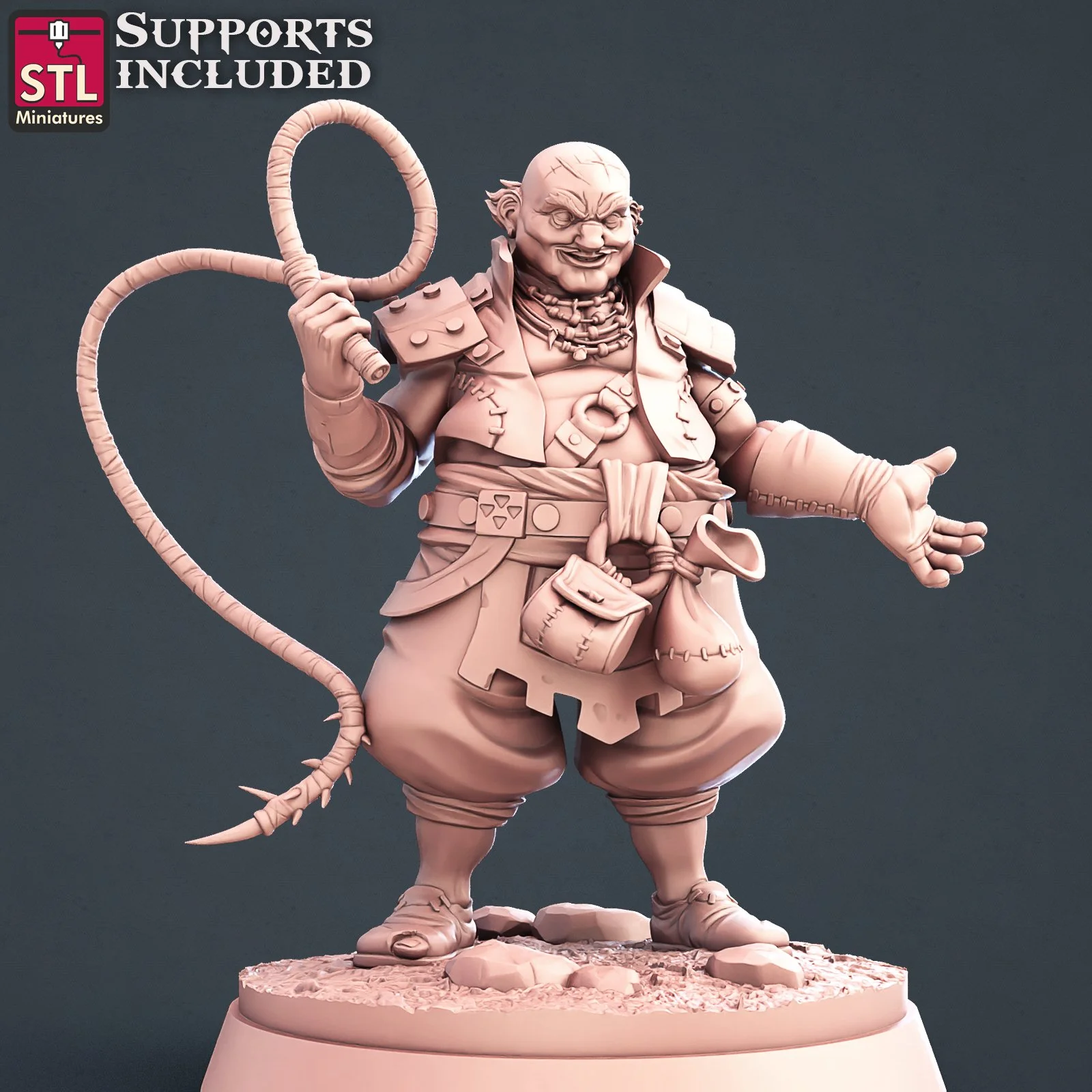 A commanding merchant miniature wielding a whip, dressed in tattered but authoritative clothing, ready to exert control over the slaves.